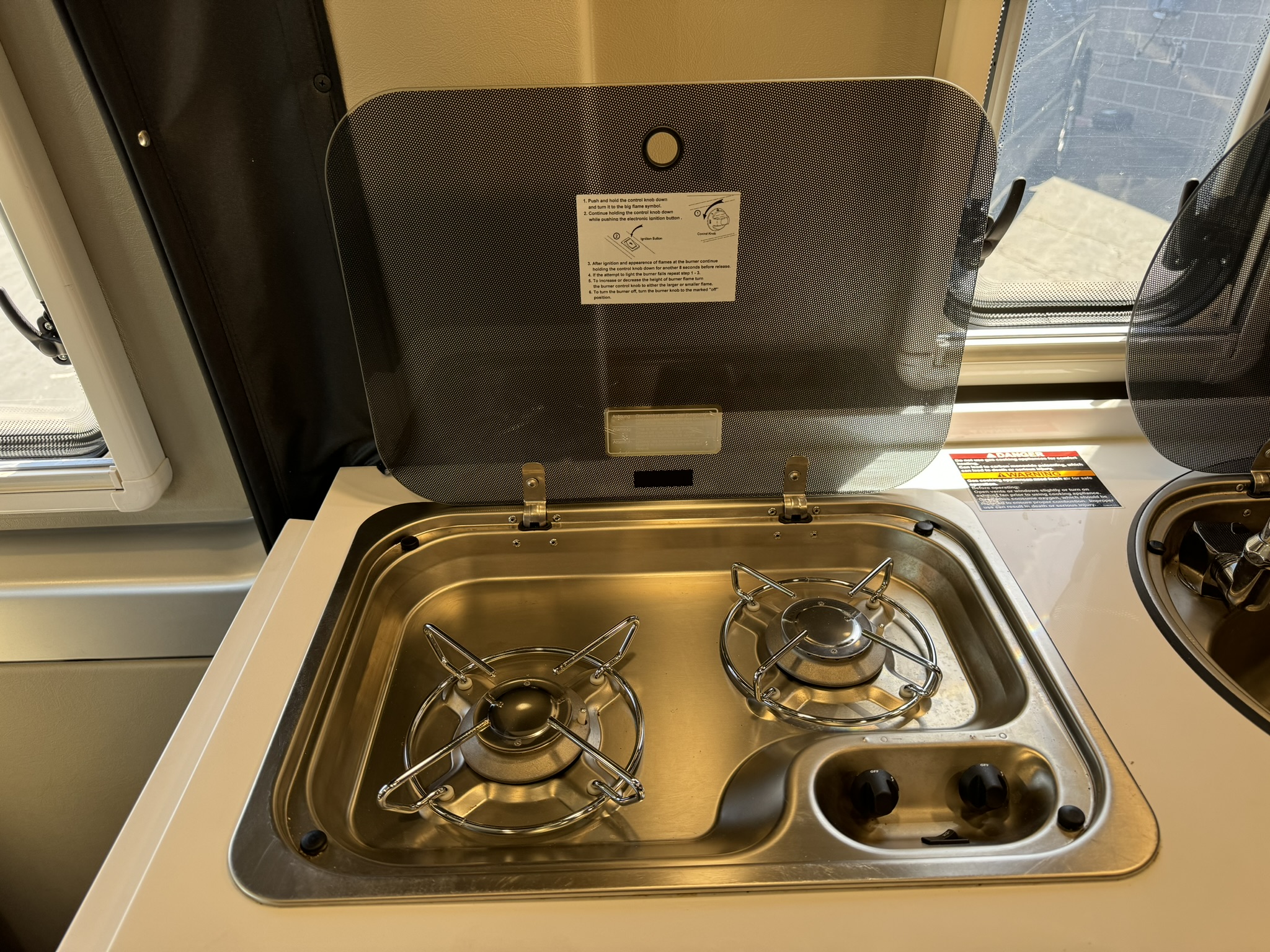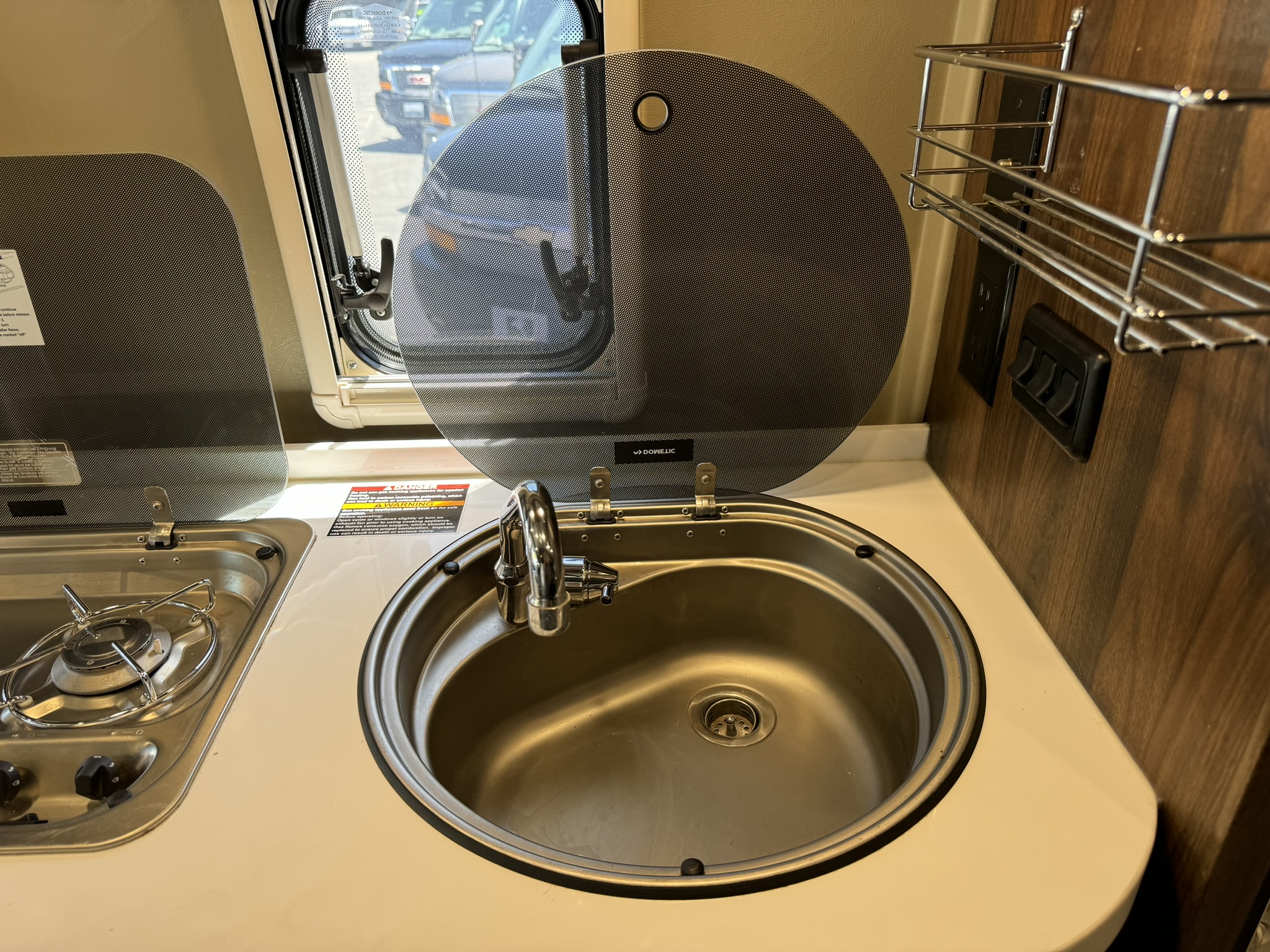 - Galley-Style Kitchen with a Two-Burner Stovetop and Bowl Sink.